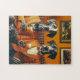 Två antropomorfa Great dane, klädda i orange kostym och buggar, sitter på en vintage som innehåller glas av elegant. Inställningen har en varm tonad, klassisk insida med rammålningar, vilket förbättrar den sofistikerade men ändå vismiska atmosfären.
