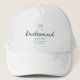 Elegant Green Script Coquette Bridesmaid's Name Hat. A modern and minimalistic, olive green bridesmaid's trucker hat, designed with script lettering, a coquette aesthetic and bow. Personalize with your bridesmaid(s) name, bachelorette or wedding location, and date if desired.