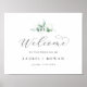 This elegant greenery wedding welcome poster is perfect for a simple wedding. The modern elegant design features a natural botanical arrangement of eucalyptus, leaves and plants with a subtle mint green watercolor wash accent. Customize the poster with the name of the bride and groom, and the date of the wedding.