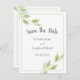 Elegant och enkel vattenfärgsgrej, löv med namn i skript och enkel typografi. En så vacker chic bröllop spara datum.