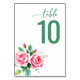 Det här bröllopsbordskortet har en minimalistisk design med en ren vit bakgrund, vilket skapar en elegant och modern estetik. Siffran "10" visas framträdande i fet grön stil, åtföljd av ordet "table" skrivet i ett delikat kursivt skrivstil ovanför. En charmig illustration av rosa rosor med gröna blad ger en touch av naturlig skönhet till kompositionen. Den balanserade layouten och den mjuka färgpaletten förmedlar en förfinad och lugn stämning, vilket gör den perfekt för att tillföra en sofistikerad touch till din bröllopsmottagning.