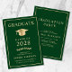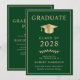 Elegant grön universitetsavgångsannons och festinbjudan med en guldavgångsmössa och modern guldtypografi för examenens namn, avgångsklass, universitet eller högskola, examen och huvudämne eller utmärkelser. På baksidan läggs detaljer om avslutningen till.