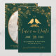 Meddela om er bröllop med dessa eleganta smaragdgröna och gyllene save-the-date-kort. De har gyllene fåglar, gyllene blommor och modern typografi på smaragdgrön bakgrund. Lägg in er egen foton och er bröllopswebbplats på baksidan.