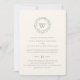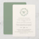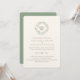 Enkel elegant bröllopsinbjudan på papper med klassisk typografi och grön krans i akvarell med monogram. Baksidan är olivgrön.