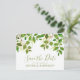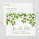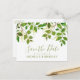 Vilda trädgård "save the date" vykort med en organisk kant av frodiga gröna blad målade i akvarellstil, och en "save the date" mall för bröllop i olivgrönt.