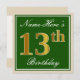 Den här enkla inbjudan och inbjudan från elegant födelsedagsfest innehåller ett personlig som "Namn-här's 13:e födelsedag" (med "13:e" som har ett utseende som liknar guld) i en kvadrat med grönt färgad och med en enkel kontur från gräns. Namn är i en elegant som är skript som liknar den vita färgaden och kan anpassas. Information om inbjudan till personligen i baksidan har funktioner. Ett födelsedagsfest inbjudan som detta skulle kanske kunna användas när man bjuder in människor till en födelsedagsfest som hålls för någon som firar sin trettonde födelsedag. [~Z0000225]