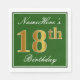 Den här enkla och elegant pappra napkin-designen innehåller ett meddelande som "Namehär's 18:e födelsedagen" (med "18:e" som har en faux-guld-liknande färg) i en kvadratisk grönt-färgad med en enkel gräns-kontur. Namn är i en text som liknar en text med en vit färgad och kan vara personlig. Napkins som dessa kan kanske användas i en födelsedagsfest till någon som firar sin artonde födelsedag. [~Z0000137]