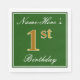 Den här enkla och elegant pappra napkin-designen innehåller ett meddelande som "Namn-här's 1st Birthday" (med "1st" som har ett utseende som liknar guld) inom ett fyrkantigt område av grönt färgad med en enkel gräns-kontur. Namn är i en text som liknar en text med en vit färgad och kan vara personlig. Napkins som dessa kan kanske användas i en födelsedagsfest till någon som firar sin första födelsedag. [~Z0000137]