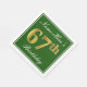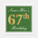 Den här enkla och elegant pappra napkin-designen innehåller ett meddelande som Namn-här:s 67:e födelsedag (där "67:e" har en fingerad guld-liknande färg) inom ett fyrkantigt område av grönt färgad med en enkel gräns-kontur. Namn är i en text som liknar en skript med vit färgad och kan anpassas. Napkins som dessa kan kanske användas i en födelsedagsfest till någon som firar sin sextiosjunde födelsedag. [~Z0000137]