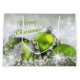 Elegant julklapp med vackra grönt glittrande julprydnader, vitt mousserande ljus, glansigt silver pärlor och tinsel.