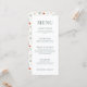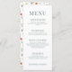 De sofistikerade och delvis botaniska menykorten i bröllop har gröna löv med terracotta och varma blommor av orange.