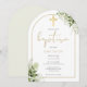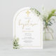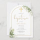 Med känsliga akvarell gröna blad och en elegant guld båge och krucifix, kan denna snygga könsneutrala dop inbjudan anpassas med din speciella information. Designad av Thisisnotme©