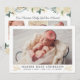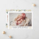 Elegantens kort för födelseanmälan som introducerar ditt söta flicka har ett stort foto från det nyfödda landskapet på framsidan med mjuk svart text som kan vara personlig med baby fullt namn och födelsestatus. Kortets baksida innehåller ytterligare tre (3) fyrkantiga foton med blommigt vattenfärg gräns som är utformade för ro, peony och ranunculus blommor och löv i träskade av neutralt, guld och grönt. Fototips: skörd ditt framfoto till en 4 x 6,5-tums storlek och dina bakfoton till en fyrkantig storlek innan de överförs till platsen.