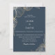 Vackra golden line jobbar botaniska blommor och löv på trendiget muterade marinblått, bröllopsinbjudan. Kortets baksida har en elegant gulddiamantlattice mönster.
