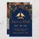 Meddela din bröllop med dessa eleganta gyllene blom-fåglar marinblå save-the-date-kort som har en mörkblå bakgrund som är prydd med ett invecklat gyllene blomstergrönsmönster och modern typografi. Kombinationen av den rika marinblå och det skimrande guldet skapar en elegant och lyxig estetik. Sätt in ditt foto och din bröllopswebbplats på baksidan.