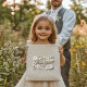 Snygg tote med ord Flower Girl i en söt guld-metall med vackra vita blommor, guld och blått löv. Lägg till ditt namn, monogram för att anpassa dig.