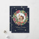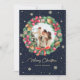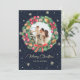 Elegant blått julkort med ett foto inuti med en vattenfärgsmand av bär, holly, gräs-koner, barrträd träd grenar och poinsettimiska blommor på mörk blått bakgrund med en guld-handskriven teckentitel, snöflingor och fallande snö. Anpassa enkelt det här vattenfärgliga fotojulkortet med din bild, en familj namn och text. Bakgrunden till färger kan ändras till vilket färg som helst.