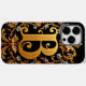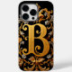 Utsmyckad gyllene bokstav B på svart bakgrund, omgiven av intrikata blomsterdesigner i vitt och guld, som utstrålar lyx och sofistikering. Perfekt för dekorativa eller designändamål.