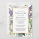 Elegant, vit och guld blommigt firande av livets inbjudan med en guld ram, med lila blommor, vit calla lilies, orchids och greenery. Ett foto på blommigten ram längst bak.