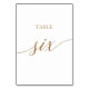 Det här guld-kalligrafin bord 6-bordsnumret i elegant är perfekt för ett enkelt bröllop. Neutraltens utformning har ett minimalistiskt kort som är dekorerat med romantisk och vismisk faux-folie guld typografi. Kortet skrivs ut på framsidan och baksidan (dubblan). Andra bordsnummer i samlingen säljs separat. Obs! Den här designen har inte äkta guld-folie. Det är en grafik av hög kvalitet som framställs som guld-folie.