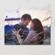 Den här söten sparar datumet för vykort med romantiskt skript och ett stort foto. På vykortets framsida skrivs elegantens kalligrafi med texten "Spara datumet" i guld och överträffar ett foto som är orienterat mot landskapet. Parets namn, bröllop och bröllop är skrivna i vitt. Lägg till ytterligare information (t.ex. en bröllop-webbplats) på baksidan av vykortet.