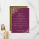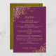 Denna vackra bröllop-meny är enkel, elegant, sofistikerad och snyggt. Den har en elegant-kassip för färgad av lila eller magenta med lacy guld-manusgrafi och delikata gyllene kurvor och snurrar i hörnen. Baksidan är en vacker marmorerad guld färg.