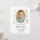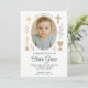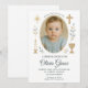 Vacker och minimalistisk fotodopinvitation för en babyflicka. Innehåller handritade religiösa symboler inklusive ett guldkors, ljus, kalk och stjärnor, i kombination med mjuka gråblå botaniska accenter. Helt anpassningsbar med ditt barns foto och dopdetaljer.