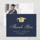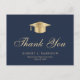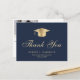 Elegant mörkblå examens tack-kort med en guld examensmössa, "Tack" i ett formellt guld skrivstil, och examenets namn, skola och årskurs i klassisk guld serif typografi. På baksidan, ladda upp ett foto och anpassa din tack-meddelande eller lämna tom för en handskriven not om så önskas.