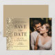 Inbjudan till Elegant Guld Photo Bröllop spara datum innehåller ett brunt skript i elegant på en bakgrund i guld glitter med ditt favoritfoto. Perfekt för bröllop, födelsedag, årsdag, Bat mitzvah, babyduschar, party och firande. Designad för dig av © Evco Studio på www.zazzle.com/store/evcostudio