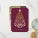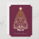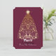 Julhälsningskort. Elegant julgran med guldglitter och filigran på vinröd bakgrund. Rolig, anpassningsbar text som du kan ändra till valfri högtid. Baksidan har en guldglittrig bakgrund och plats för att lägga till familjefoton. Lägg till ett år och evenemang också.