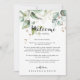 I elegant välkomnar guld grönt bröllop brev en perfekt för ett modernt bröllop. Utformningen har handritade guld och botaniska grönten eukalyptus löv, inspirerande konstnärlig skönhet. Anpassa fronten med ett välkomstmeddelande till dina gäster och till namn. Anpassa baksidan med schemat för händelser och annan användbar information.
