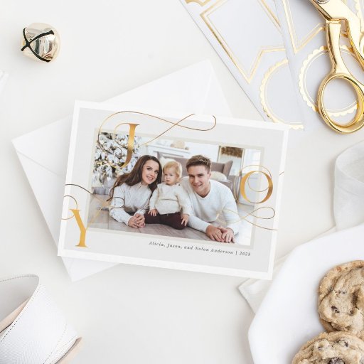 Fira årstiden med detta lyxaktiga "Joy"-kort för helgdag, som har en snyggt faux guld-folie med typografi och en elegant som snurrar upp ett omhuldat familjefoto i en mjuk, vit och elfenbenspalett. Den sofistikerade layouten lyfter fram "JOY" i ord i ett fantastiskt, flytande brev och skapar den som ett vackert centrum för dina semesterhälsningar. Som en del av en sammanhängande helgdag finns den här designen även tillgänglig för matchande presentkort, märkre och annat, vilket gör att du kan skapa en samordnad och polerad sökning efter all din helgdag. Perfekt för att dela festlig värme och elegans med vänner och familj.