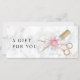 Modern och elegant presentkort för hårstilistorna med faux guld sax & komb, rosa och vit ros, vit marmorbakgrund och kalligrafteckensnitt för elegant.