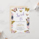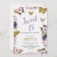 Elegant Sweet 15-inbjudan med guld- och rosa fjärilar och blomsterdekorationer mot en marmorerad bakgrund. Texten är lila och guld och förmedlar en festlig ton.