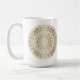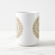 Den fantastiska cirkulära blommigten lotus mandala designen mugg i ljussimulerade metalliska guld på vit bakgrund, inspirerad av mehndi henna body art. Utformningen upprepas på båda sidor om mugg. Formaterad för att passa 15 oz Classic, Two-Tone eller Combo mugg.