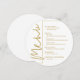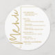 En rund vit meny för middagsbjudningar har dina menyval i elegant guldskrift, perfekt för en modern bröllopsmottagning, middag före bröllopet, årsfest eller någon speciell tillställning med sittande middag. Anpassa enkelt med din middagsmeny och detaljer. FLER färger i vår butik.