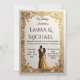 En lyxig bröllopsinbjudan med en utsmyckad gyllene floral ram, elfenbensvit bakgrund och elegant brud & brudgum siluett i skimrande guld. Perfekt för par som söker tidlös elegans och en premium stil för bröllopsinbjudningar.