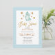 Fira att ditt ädla baby kommer att dyka upp med denna vackra och söta "Baby Shower-inbjudan" med en blå dinosaurie som glatt viftar hej under stjärnorna överst. Rubriken har guld-folie som kalligrafi. Bakgrunden är Klistra in blå pil mönster. Alla texterna är i förväg ordnade så att du enkelt och snabbt kan anpassa dig med dina babyduschdetaljer.