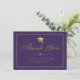 Skicka en elegant tack till din familj och dina vänner för deras stöd. Den här designen innehåller en illustration av en studentmössa framtill med ett faux-guld klassiskt skript på en lila bakgrund som läser. "Tack" med ditt namn, din skola och din klass/år nedan för att anpassa dig efter en blomstrande guld-delare. Kortets baksida har ett meddelande om anpassningsbar och namnteckning. Designad av konstnären ©Susan Coffey.