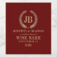 Elegant, enkel vin-etikettdesign med monogrammet. Guld och silver krans med ett monogram anpassade. Mörk röd, utbytbar bakgrund och textmall för anpassade.