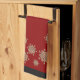 Kökshandduk med elegant glatt guldfärgad glitter snöflingor på röd bakgrund, putsad i svart.