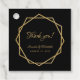 Denna moderna, eleganta geometriska bröllopsetikett kombinerar två trender från 2019: geometrisk och metallisk (guld). Den har en oregelbunden guldbård från två gula hexagoner som överlappar varandra på en svart bakgrund. Titeln "Tack" och brudens och brudgummens namn är skrivna med ett elegant kalligrafiskt skript. All text har en gyllene gul färg, som guldbården.