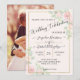 "Elegant guld vattenfärg blomster skript bröllop med foto inbjudan." Enkel och modern, men ändå elegant och sofistikerad design med guldelement, vattenfärg-målade blomsterkluster och ert förlovningsfoto på baksidan. Subtila, tredimensionellt renderade guldfärger med känsliga glitter-nyanser på kanter och avdelare är ihopparade med kalligrafisk handskrift. En typografisk layout med et-tecken som avdelare har skapats av den internationellt licenserade konstnären och designern Audrey Jeanne Roberts. Upphovsrätt.