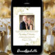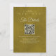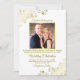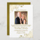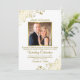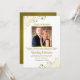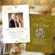 Den vackra bröllopsinbjudan är snyggt, enkel och elegant. Den har guld-skriptbokstäver på en klassisk vit bakgrund med blommigt-faux-foliefiligree i varje hörn. I designen ingår ditt foto av bild i ett gyllene ram tillsammans med alla viktiga detaljer. På baksidan finns anpassadet QR-kod och detaljinformation så att du kan skicka gästerna till en webbplats för information och OSA.