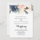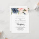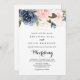 Den här eleganten är en inbjudan till en enkel bröllop om blommigt före och efter bröllopet i guld. Utformningen har vackra, handmålade mörk blått, blå, marinerade, rosa, blommor, blommor från guld och blad av grönt, buntade i elegant bouquets. Spara papper genom att på baksidan av inbjudan ange mer information i stället för på ett separat visitkort.