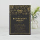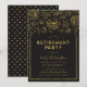 Elegant blomsterlig pensionsfest-inbjudan med falskt guld folieblomma och ram på en mörkgrå bakgrund på framsidan. Inbjudan har ett falskt guld prickmönster på en mörkgrå bakgrund på baksidan.