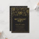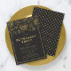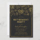 Elegant blomsterlig pensionsfest-inbjudan med falskt guld folieblomma och ram på en mörkgrå bakgrund på framsidan. Inbjudan har ett falskt guld prickmönster på en mörkgrå bakgrund på baksidan.