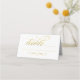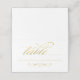 Ett polerat bröllops escortkort med ordet "bord" i flytande guldbokstavsstil med en dekorativ rullande svep på en skarp vit bakgrund. Den starka kontrasten mellan guldtext och rent vitt papper skapar en fräsch, klassisk look för era mottagningstabeller. Varje tältvikkort anländer förtryckt, och gästnamn och bordstilldelningar fylls i för hand.