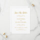 Eleganta, utsökta save the date-kort i vacker guldtrycksfärg är klassiska, formella och tidlösa. En romantisk design utan ramar låter dig enkelt välja pappersform för ditt förlovningsmeddelande. Två dekorativa svepande former som var och en innehåller ett hjärta omsluter varsamt namnen på bruden och brudgummen. För bästa resultat, hoppa över rader och använd versaler som i provet.