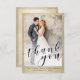 Tacka dina bröllopsgäster med stil med detta eleganta anpassade fototack-kort. Denna designmall med typsnitt har din bild på framsidan med en falsk guldbård och orden "Tack" och era namn med bröllopsdatum för att anpassa. Baksidan av vykortet har ett anpassat meddelande och signatur på en falsk guldbakgrund. Designad av konstnären Susan Coffley.